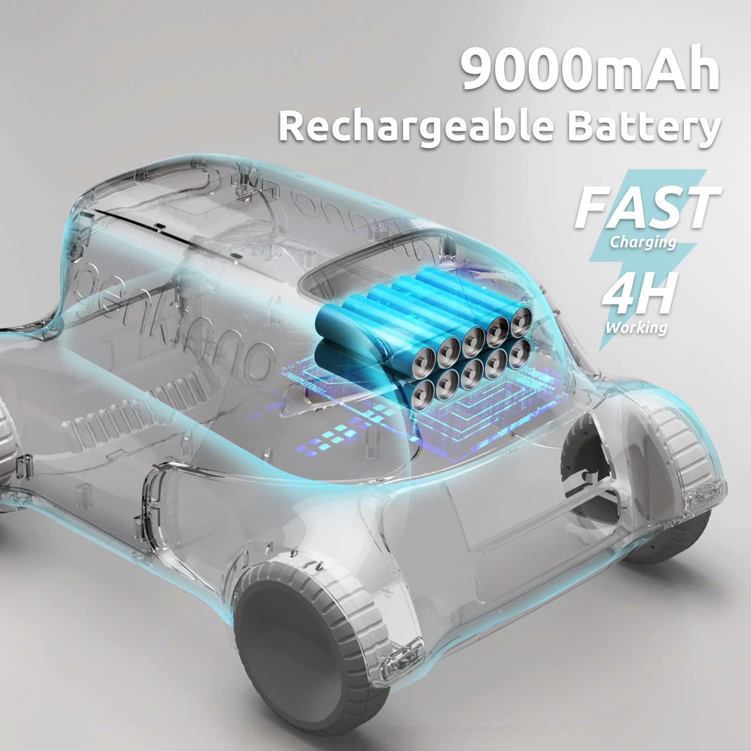 - Compatibility with Different Swimming Pools: Genkinno P1 will leave your pool sparkling clean in just 2 hours. A large 9000mah battery life gives P1 a 4-hour max runtime and up to 2,500 sqft coverage on a single charge. The cordless pool vacuum can effortlessly handle slopes up to 15 degrees, adapting easily to different pool shapes and sizes.