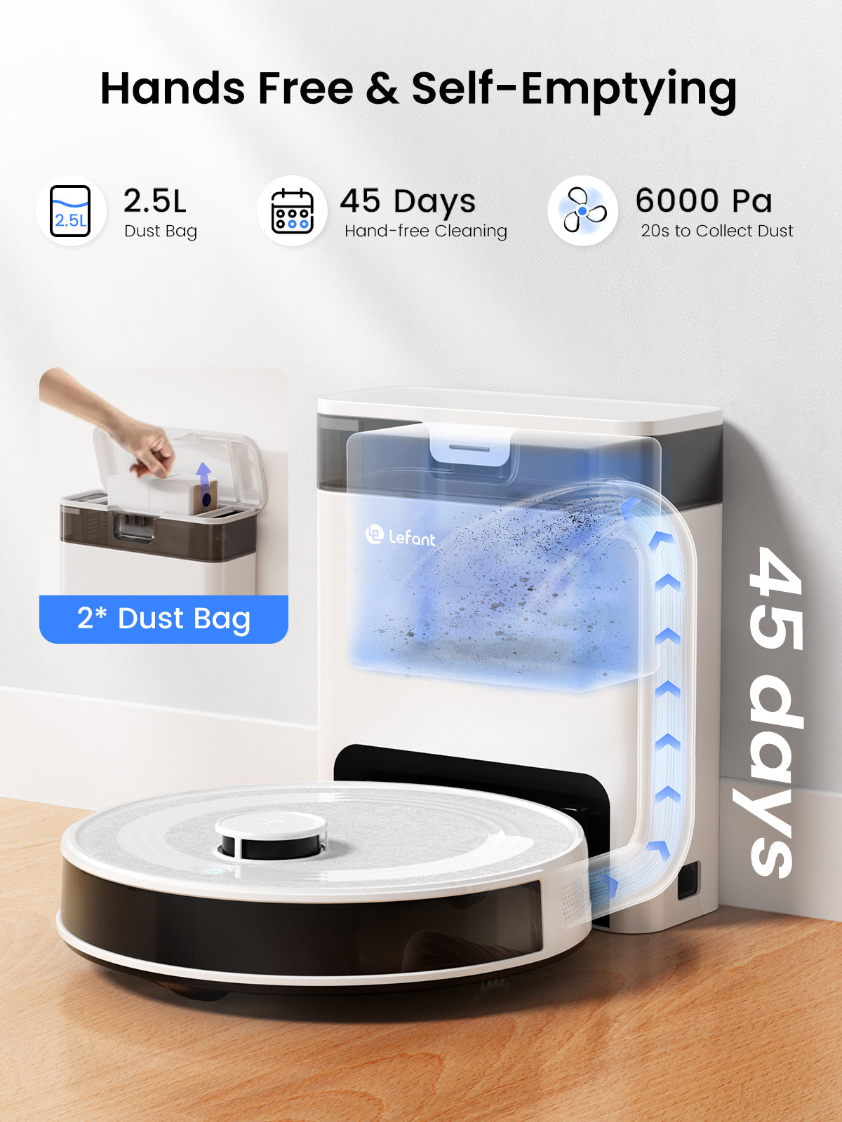 45 Days of Hands-Free Cleaning:The robotic vacuum with a self-emptying station, equipped with two 2.5L dust bags, allows you to enjoy over 45 days of uninterrupted, hands-free cleanliness. This minimizes the need for manual waste disposal, keeping your home effortlessly clean for longer.