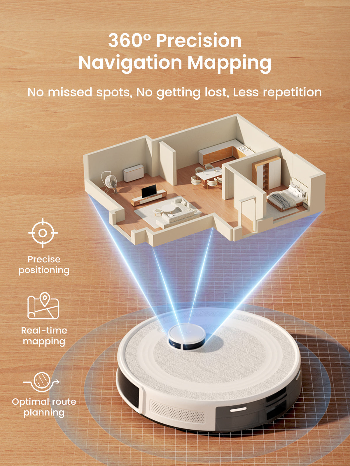 LiDAR Navigation & Smart Mapping: With advanced 360° LiDAR navigation, it accurately maps your home for efficient and systematic cleaning. It automatically creates multi-level maps, divides rooms, and intelligently plans cleaning routes to minimize missed spots and unnecessary repetition.