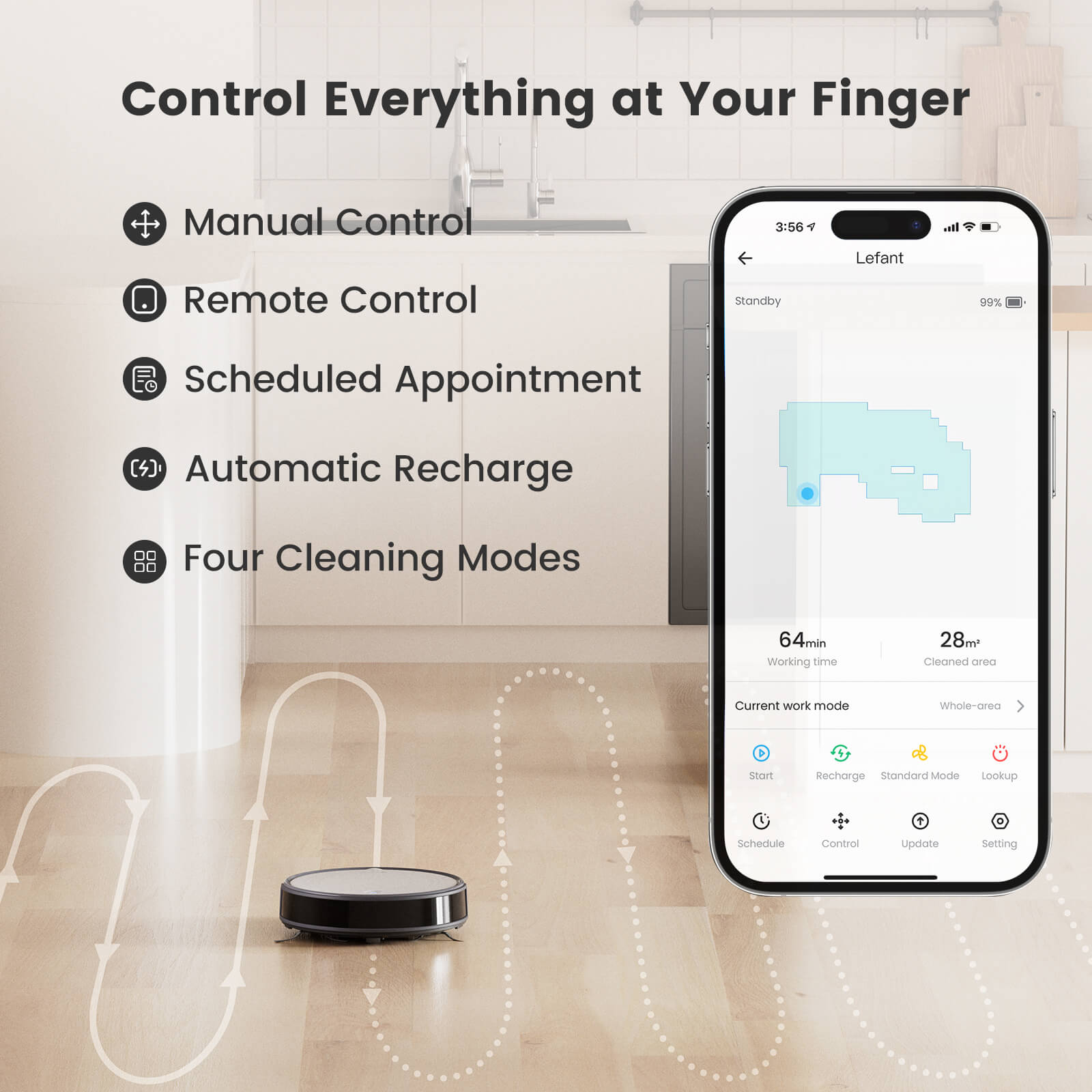You will love the scheduled cleaning. You set up the certain schedule and type of cleaning through Lefant App. The robot vacuum will do the rest. Your house has been already cleaned when you come back. Moreover, Lefant APP can adjust the suction and direction, monitor the cleaning path, edge cleaning, etc, which adds convenience and flexibility. The robot vacuum is also compatible with Alexa and Google Assistant, allowing you to start or stop the cleaning process by voice command. (ā The APP only supports 2. 4GHz Wi-Fi.)