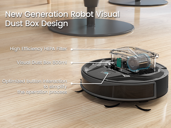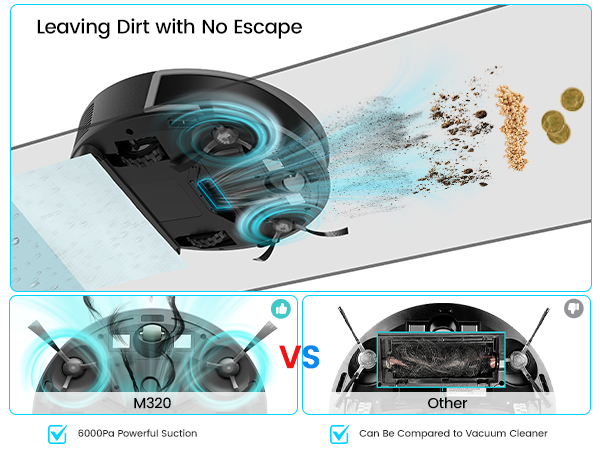 The transparent visual design let you know the situation of the dust box well, You do not need to clean the dust box frequently, saving you valuable time. M320 robotic vacuum comes with the HEPA filter. By effectively trapping small particles, including fine dust, pollen, and pet dander, HEPA filters contribute to avoiding secondary pollution and improving indoor air quality. This makes it beneficial for individuals who suffer from allergies.