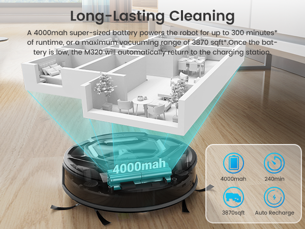 4000mah A super-sized battery powers the robot vacuum for up to 210 minutes of runtime, increases the cleaning efficiency by 50%. When cleaning is finished or the power supply is low, the vacuum cleaner robot will automatically navigate back to the charging station to minimize the chances of losing.