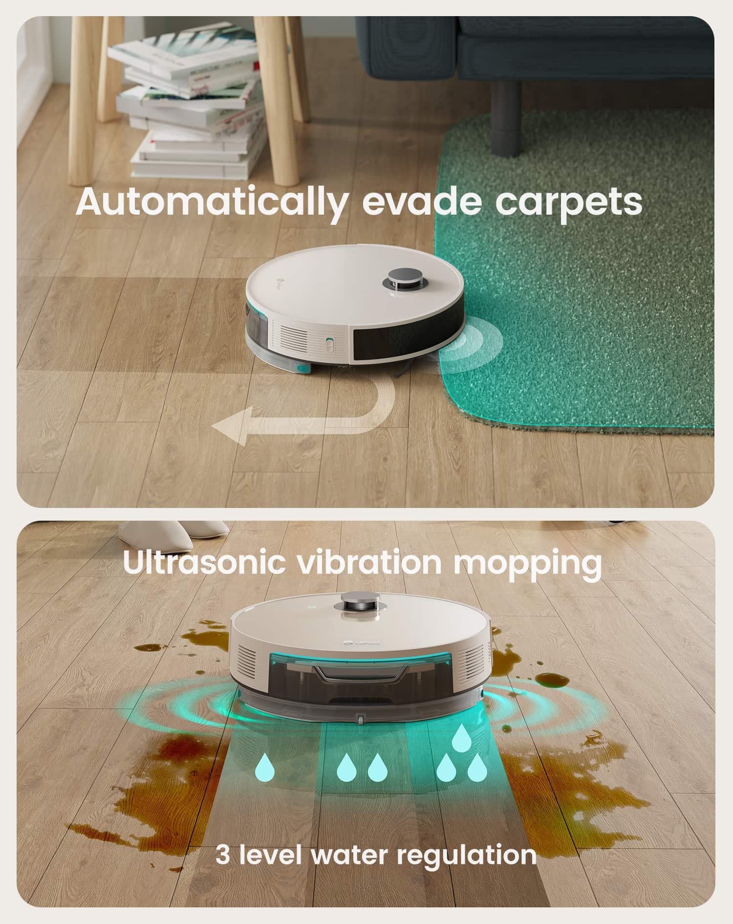 - šćUltrasonic Carpet DetectionćThe N3 lidar sonic mop vacuum emits ultrasonic waves that accurately detect the carpet, and automatically increases suction power to deep clean it. Surprisingly, in mopping mode, N3 automatically changes the cleaning direction once it detects the carpet, so you never have to worry about getting it wet.