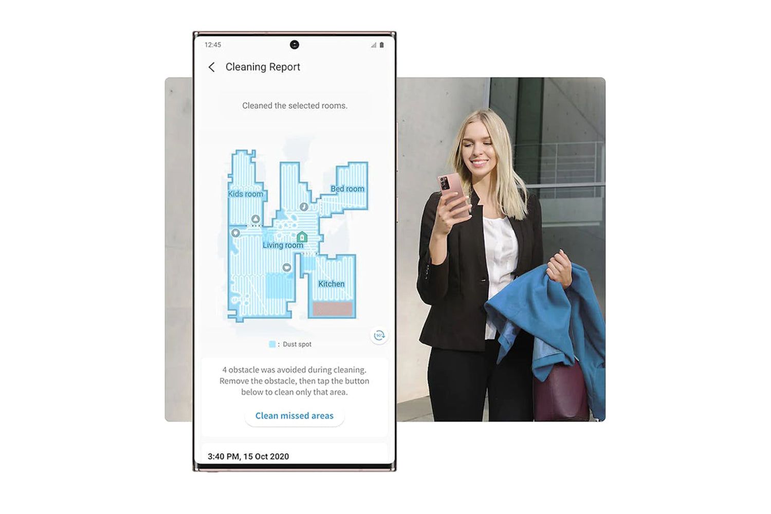 Check Jet Bot’s progress and status in real-time using a SmartThings App*. With Live Cleaning Report, you can quickly view its movement on a map of your home from wherever you are. You can see where it has cleaned, pause it or instruct it to stop. And you can also view the cleaning history.