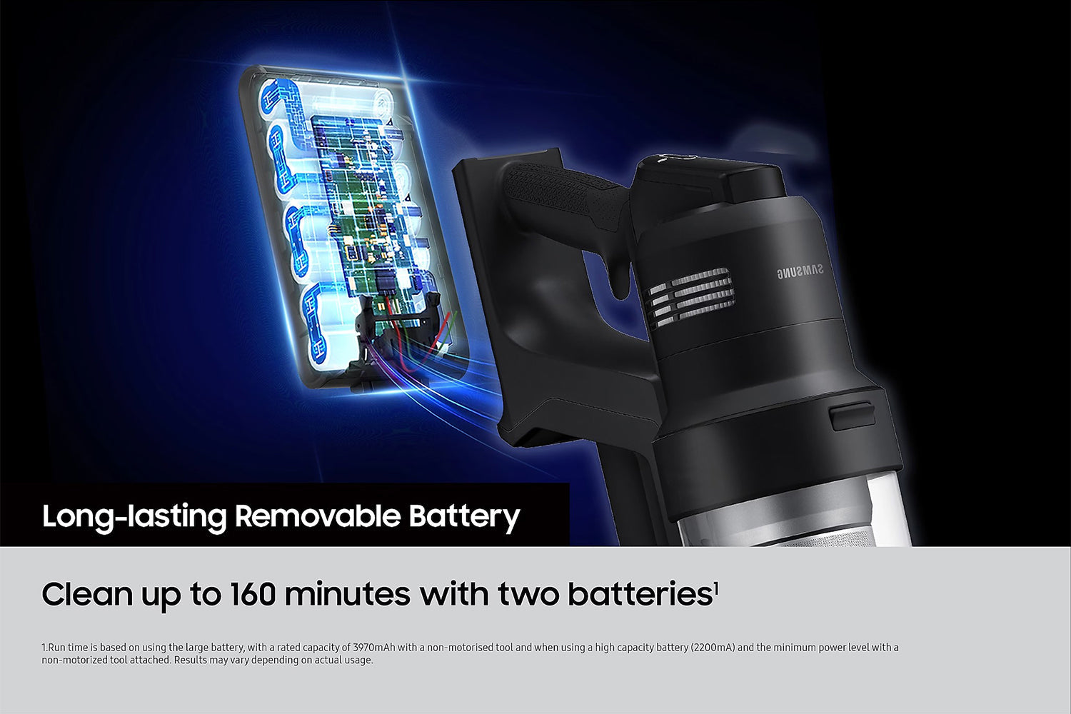Clean up to 100 mins* on a Single Battery: Removable and Powerful Battery