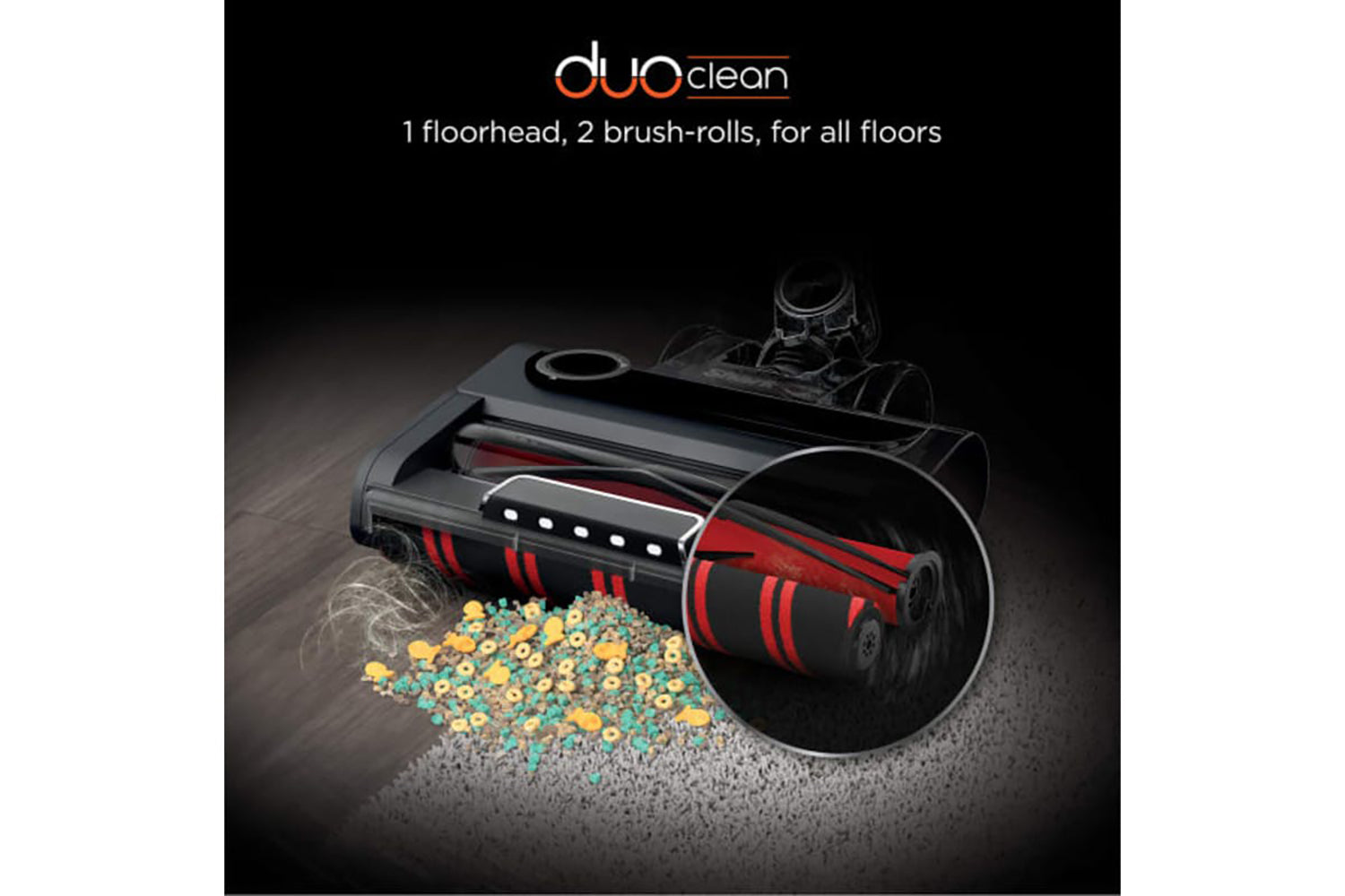 Shark’s DuoClean floorhead glides from carpets to hard floors with two motorised brush-rolls working together in one floorhead – the Anti Hair Wrap Plus brush-roll cleans deep into carpets, drawing out embedded dirt and picking up hair, while a soft front brush-roll draws in debris and lifts stuck-on dust from hard floors.