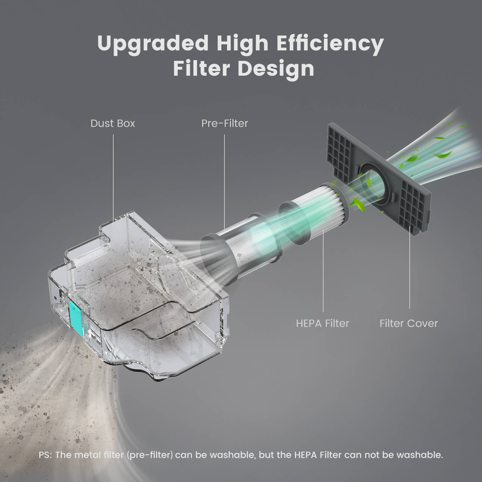 550ML dust box enables to collect more dirt and debris. You do not need to clean the dust box frequently, saving you valuable time. M310 robotic vacuum comes with the HEPA filter. By effectively trapping small particles, including fine dust, pollen, and pet dander, HEPA filters contribute to avoiding secondary pollution and improving indoor air quality. This makes it beneficial for individuals who suffer from allergies. (⚠Regularly clean the dustbin to and change the filter to prevent the robot vacuum from clogging.)