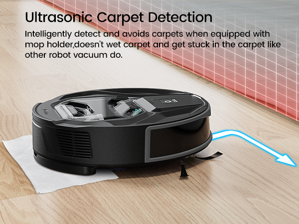 The M320 Robot Vacuum is equipped with cutting-edge ultrasonic automatic detection. With its mop attachment, it intuitively avoids carpeted areas, preventing any potential dirt and mess. When in pure vacuuming mode, it automatically enhances suction on carpets for a deeper clean. Plus, enjoy the added convenience of setting up a small carpet as a virtual barrier to avoid mistakenly entering the restroom, balcony and other places.