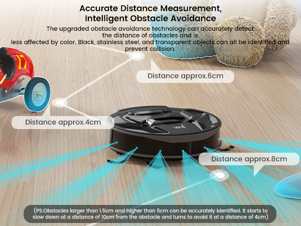 The upgraded obstacle avoidance technology can accurately detect the distance of obstacles and is less affected by color. Black, stainless steel, and transparent objects can all be identified and prevent collision, which making smarter and intelligent cleaning. (PS:Obstacles larger than 1.5cm and higher than 5cm can be accurately identified. It starts to slow down at a distance of 10cm from the obstacle and turns to avoid it at a distance of 4cm.